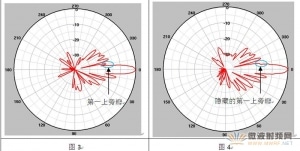 副瓣抑制是天線的重要指標,目前通常考核垂直面方向圖的第一上旁瓣,如圖3所示。但在一定頻段內,總有一些頻點的第一上旁瓣很不明顯,似乎未按預定位置出現,容易將第二上旁瓣誤認為第一上旁瓣,如圖4、圖5所示,導致指標評判錯誤。對此,當第一副瓣不明顯時,需要在預定的第一零點和第二零點之間的角域內找最大值來確定,通常是1~2倍θ3dB角域,如圖6所示。另外,也可按上側某個角域范圍內的副瓣電平進行評估,如從1倍 θ3dB處~30度范圍內,這樣既可避免上述情況,也有利于網絡覆蓋效果。