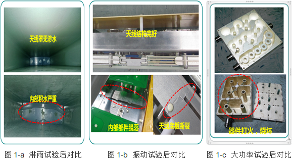 天線產品的可靠性的檢驗可以通過一系列試驗來判斷,可靠性試驗是對天線產品進行可靠性調查、分析和評價的重要手段。天線的可靠性試驗包括高低溫試驗、淋雨試驗、振動試驗、沖擊試驗、碰撞試驗、汽車運輸試驗、風載試驗、攝冰試驗和功率試驗等。通過環境試驗可以檢驗天線產品結構的可靠性。如圖1所示,為淋雨試驗、振動試驗和大功率試驗后,滿足可靠性要求的天線與不滿足的對比測試結果。