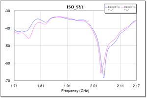 天線性能的一致性是指同一型號的天線產品的參數表現的吻合性,可以通過比較多個同類型產品的指標曲線的近似度來判斷。如圖4所示,為同一類型的多個天線電壓駐波比曲線的一致性對比,左圖的多個天線駐波比曲線趨勢一致,偏差較小,表明該類型天線駐波比性能比較一致;右圖的多個天線的駐波比曲線沒有規律,比較雜亂,表明該類型天線的駐波比性能一致性較差。圖5為天線隔離度性能的一致性比較,同樣左圖天線比右圖天線隔離度參數的一致性要好。因此,可以認為,左圖天線性能的一致性要好于右圖的天線。