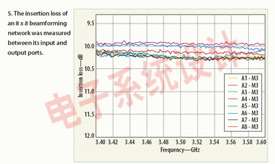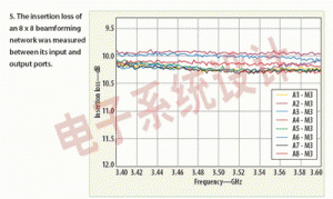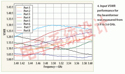 為展示該設(shè)計方法,設(shè)計了一個用于3.4到3.6GHz頻段的四束天線波束成型器。用安捷倫科技的(www.agilent.com)N5230A矢量網(wǎng)絡(luò)分析儀對其性能進行了測量,N5230A在工作時與同樣來自安捷倫的也工作在3.4到3.6GHz范圍的U3042A多口測試裝置連接。圖3、圖4和圖5顯示的是基于該設(shè)計方法的典型八波束波束成型網(wǎng)絡(luò)的結(jié)果。