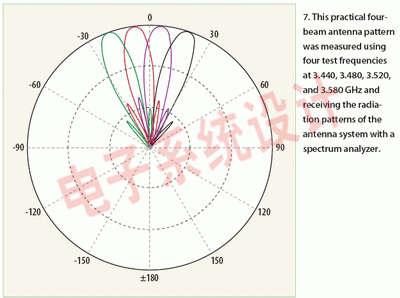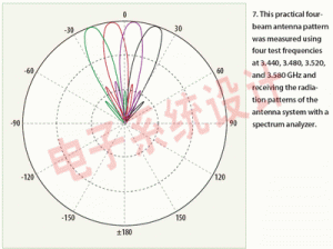 在3.4到3.6GHz頻段的開放環(huán)境對多束天線系統(tǒng)的輻射模式進行了測量。采用相位匹配RF電纜連接波束成型器與天線。波束成型器的輸入端口接3.440、3.480、3.520和 3.580GHz這四個不同的中心頻率、每個頻道的帶寬是7MHz。測試所用的RF功率是+5dBm,來自天線和波束成型器的聯(lián)合接收功率的測量是利用頻譜分析儀在距離200m處進行的。接收到信號的功率在以200m為半徑的圓周每隔1.0deg.測量一次,其中把四束天線作為圓周中心。圖7顯示了該實際輻射樣式。圖6也給出了采用MATLAB 軟件模擬得到的理論輻射樣式。